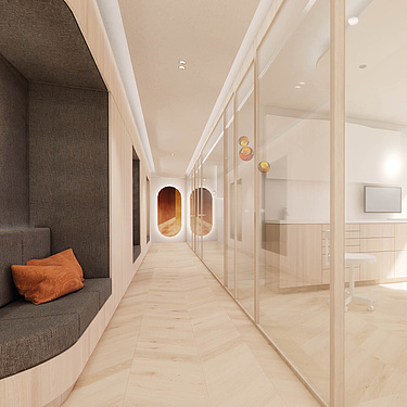 Ab Frühsommer 2026 entsteht in der 5. Etage ein neu gestalteter Bereich für Kinderzahnheilkunde und Kieferorthopädie. Klare Strukturen, modernes Design und eine ruhige Atmosphäre sorgen dafür, dass sich sowohl Kinder als auch Jugendliche und Erwachsene gut orientieren und ankommen können.